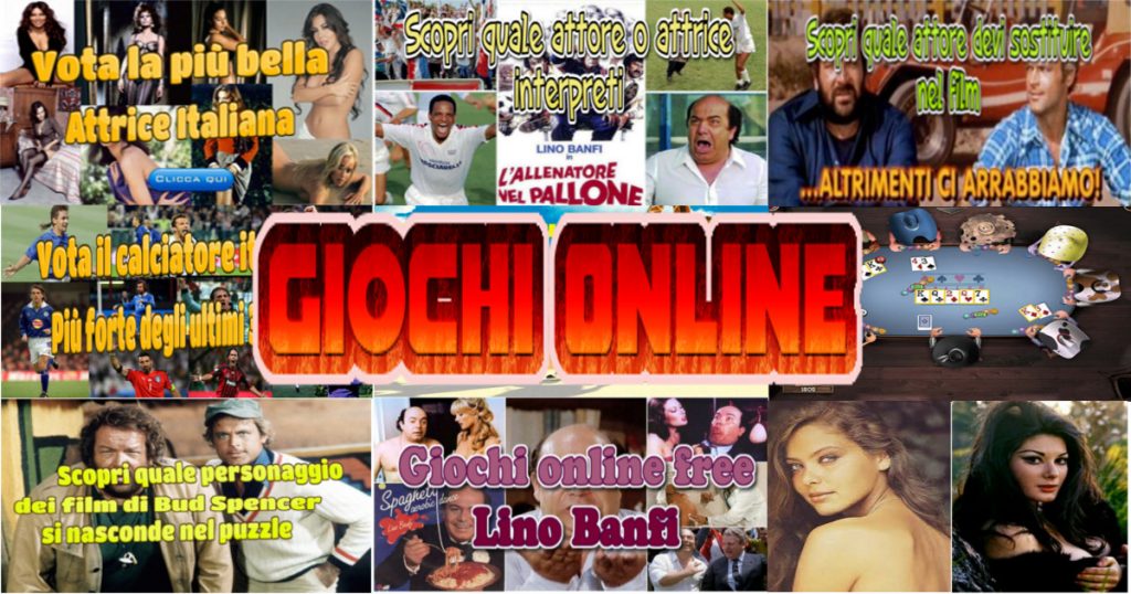 Giochi on line, raccolta originale di giochi online di vari generi divertenti. Su personaggi del cinema come Bud Spencer o Lino Banfi, insieme a tanti altri. Quiz sui film più belle del cinema o sugli attori più famosi, con le loro curiosità. Divertenti puzzle sul arte o il cinema fino ad arrivare a scene di film famosi o sui nostri idoli. E per concludere tanti sondaggi curiosi per sapere chi e attrice italiana più bella o il film che a divertito di più. Fino ad arrivare a decidere chi e stato il calciatore più forte, e cosi via.